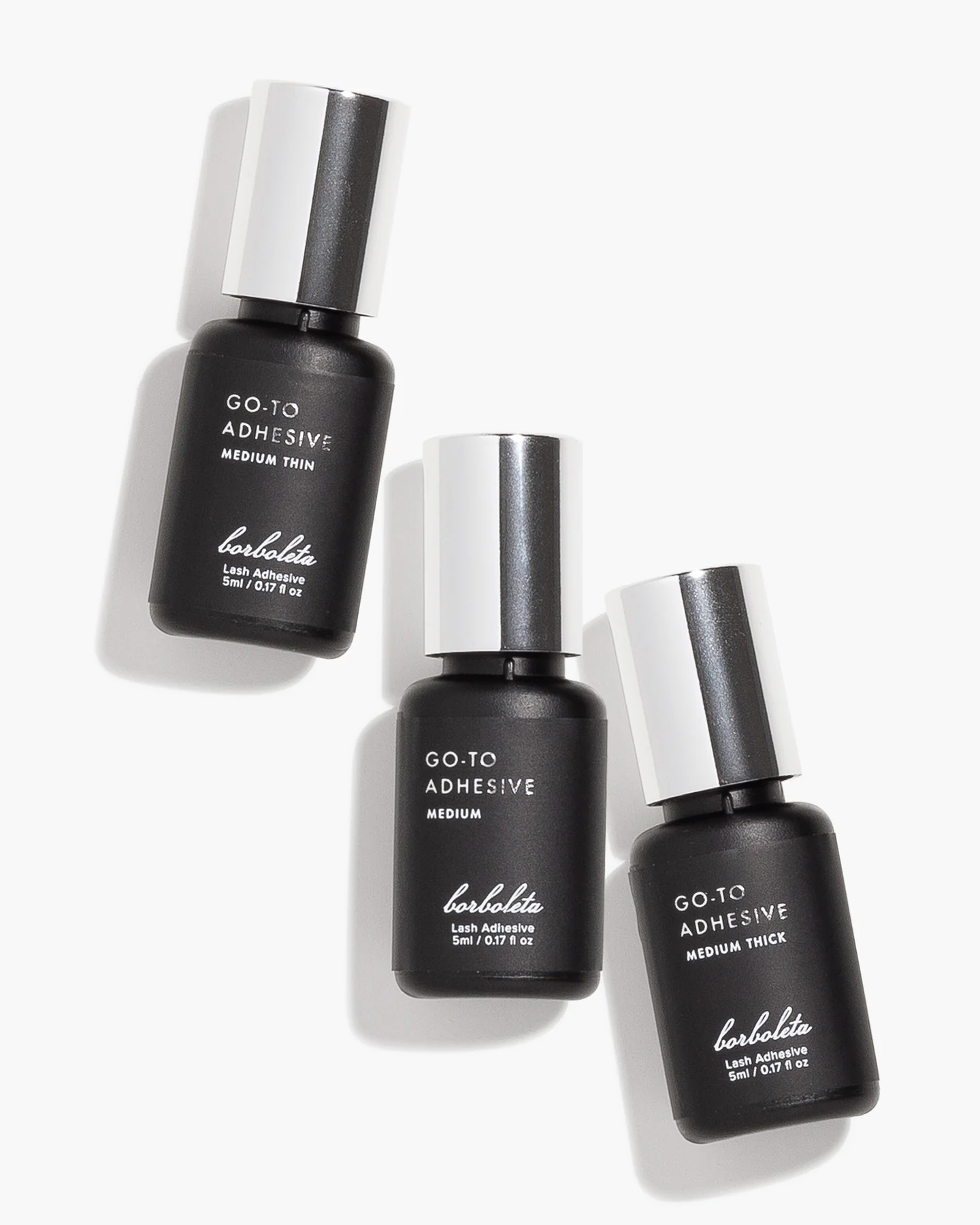 A Colecção Borboleta Go-To Adhesive foi desenvolvida exclusivamente com uma fórmula personalizada que te proporciona uma colagem imediata e uma retenção a longo prazo com a qual podes contar. A melhor parte? Uma vez que finalmente encontrámos a fórmula perfeita, fizemo-la em três viscosidades: Fina Média, Média e Média Espessa.