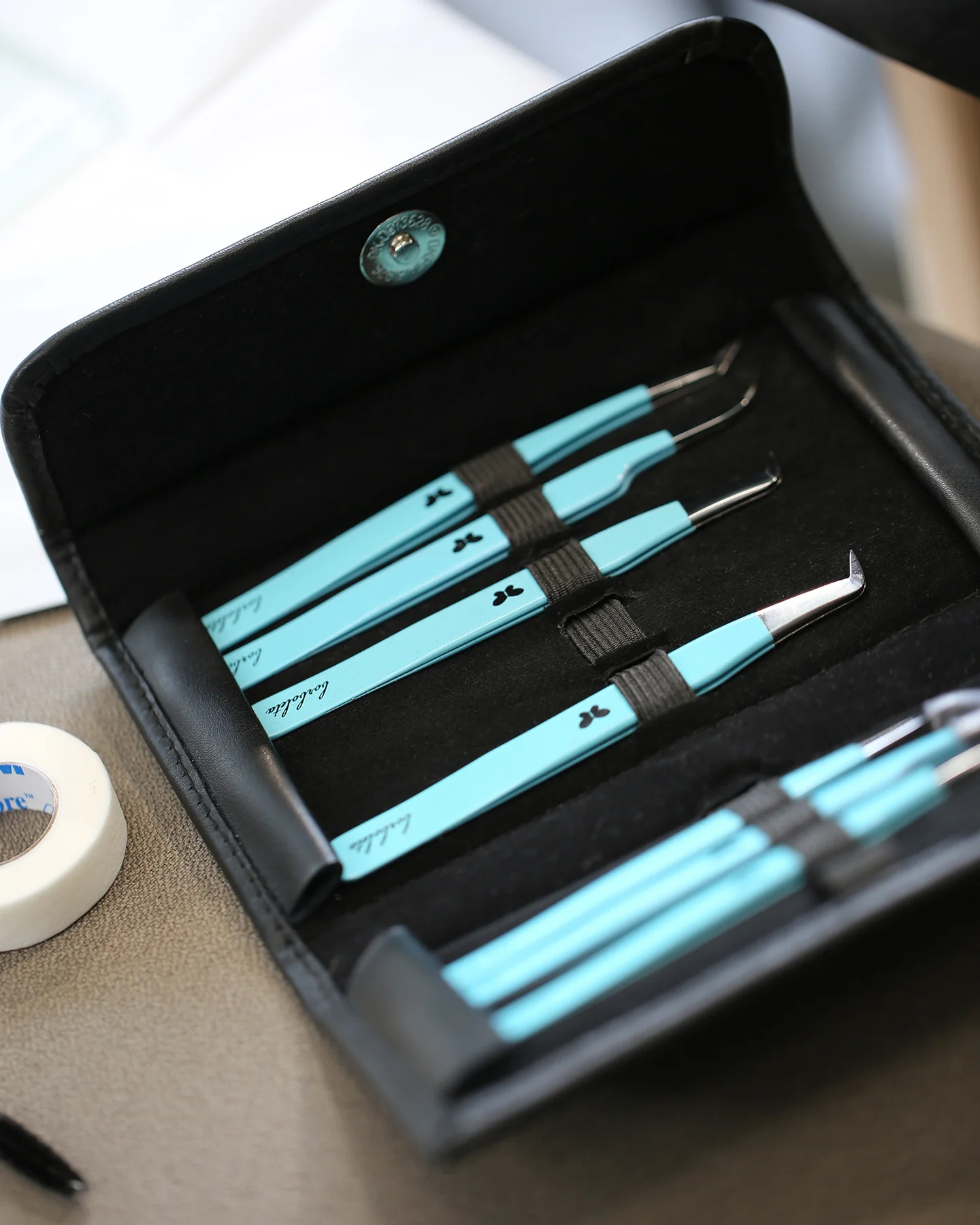• Conjunto de pinças azuis claras em estojo preto aberto