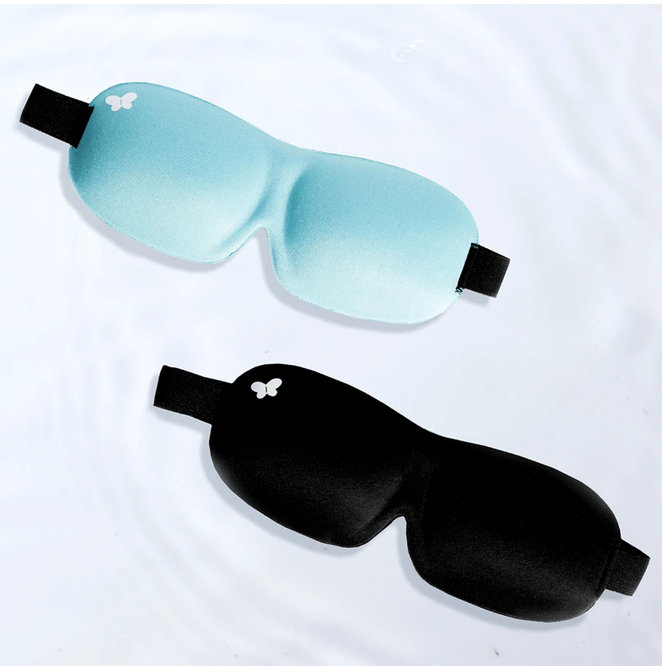 • Máscaras de dormir azul clara e preta com símbolo de borboleta