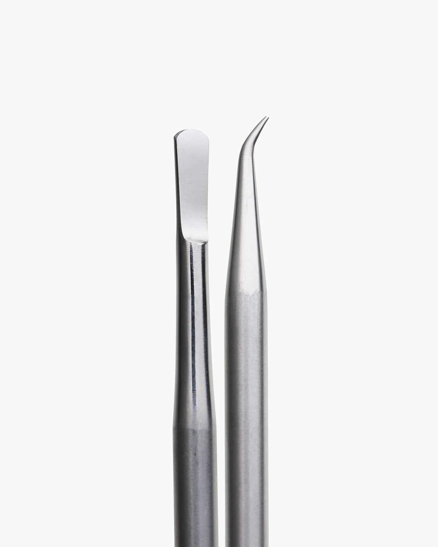 • Dois instrumentos metálicos de ponta fina, um reto e outro curvo, fundo branco