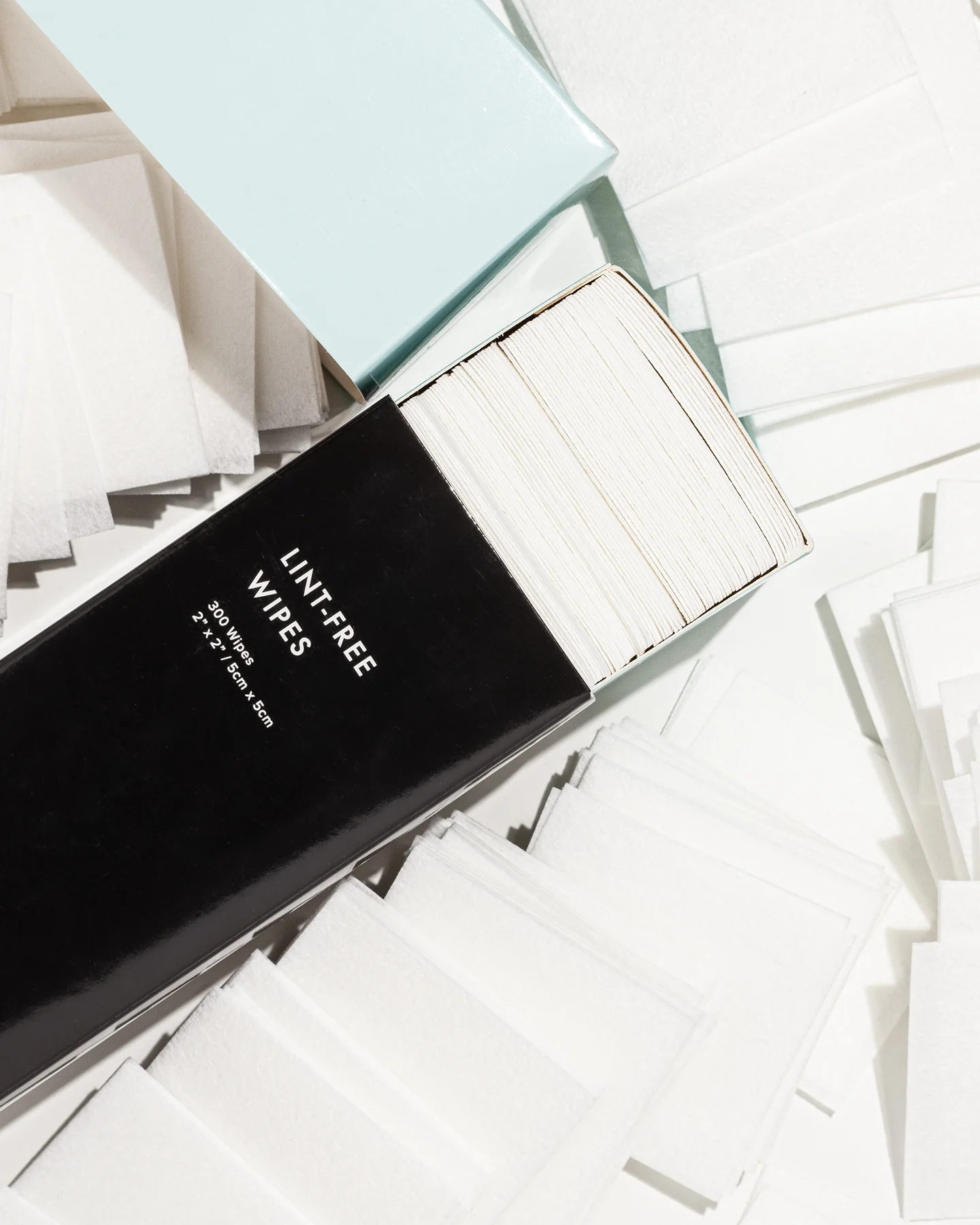 Embalagem preta com toalhitas brancas LINT-FREE WIPES entre toalhitas brancas e azuis