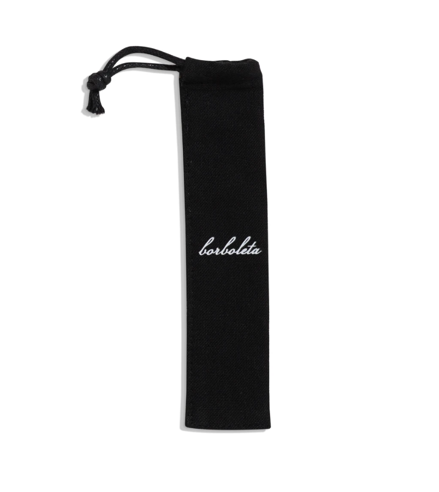 • Estojo de tecido preto com a palavra 'borboleta' escrita em branco