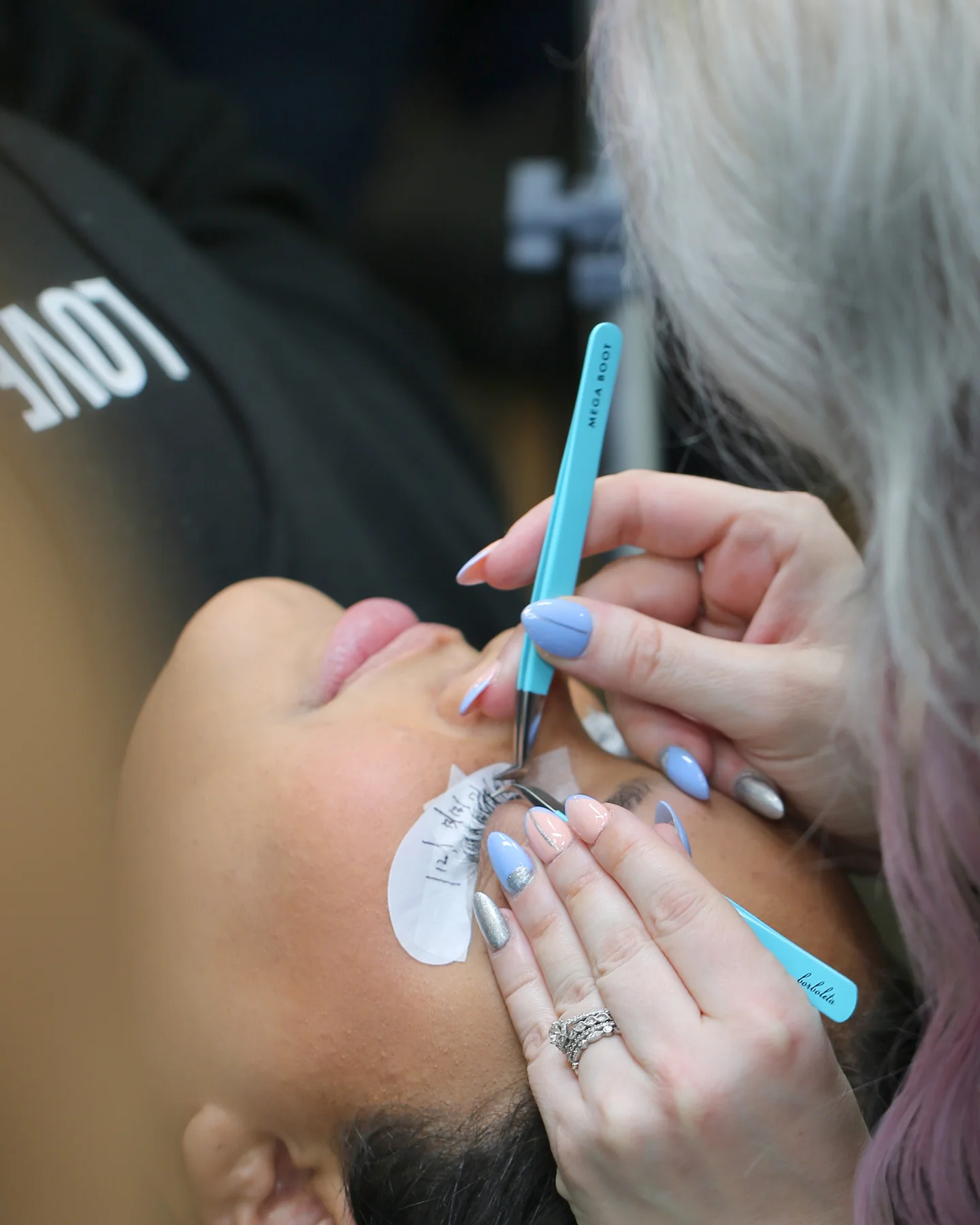 • Aplicação de extensões de pestanas com pinças azuis num cliente num salão de beleza